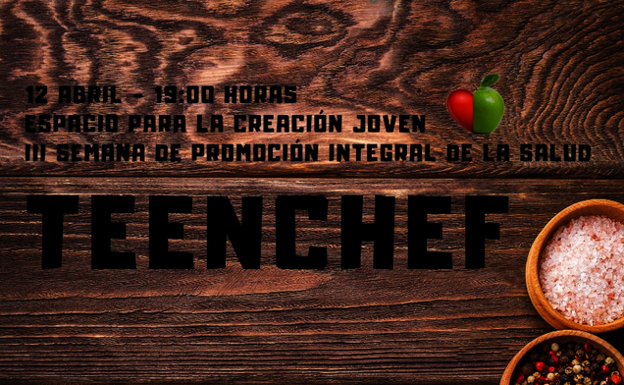 El Espacio para la creación Joven sigue realizando actividades con motivo de la III Semana de Promoción Integral de la Salud. En esta ocasión publicita un concurso colinario bajo el nombre de TeenChef que se realizará el próximo 12 de abril a partir de las 19:00 en su centro.
