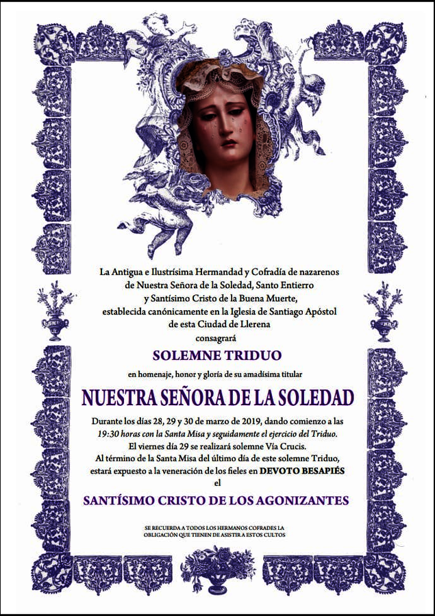 La Hermandad y Cofradía de Nazarenos de Nuestra Señora de la Soledad, Santo Entierro y Santísimo Cristo de la Buena Muerte celebra un solemne Vía Crucis esta tarde a partir de las 19:30 horas en Honor a Nuestra Señora de la Soledad en la parroquia de Santiago.