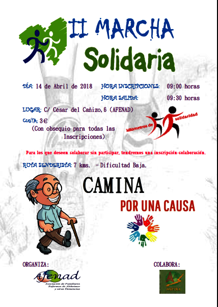 II Marcha Solidaria organizada por AFENAD CAMINA POR UNA CAUSA. La causa es el Alzheimer. La cita será el próximo sábado, 14 de abril en la sede de la Asociación a partir de las 9 horas. La ruta será de 7 kilómetros de dificultad baja.
