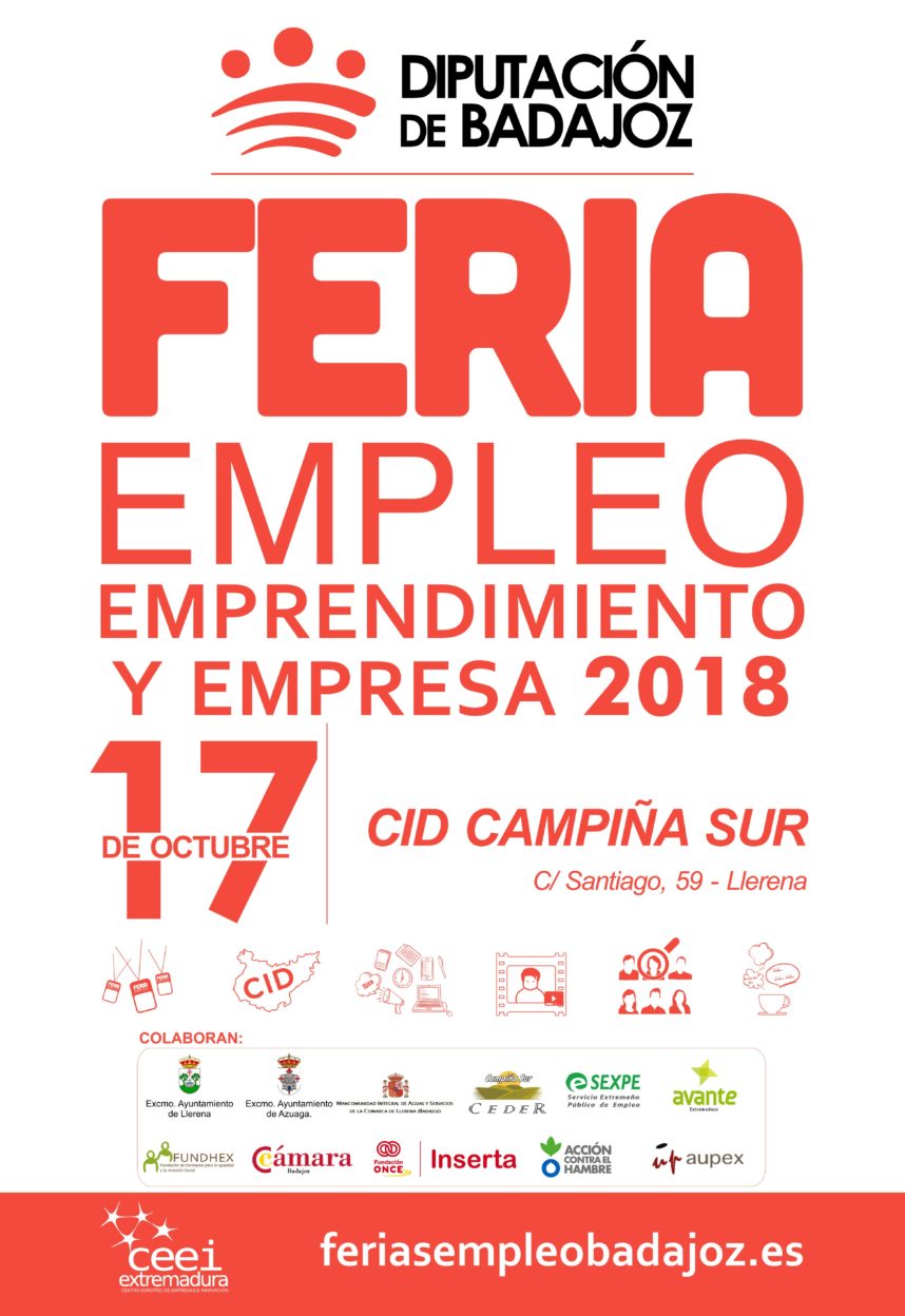 El día 17 de octubre Llerena acogerá una nueva edición de la Feria del Empleo y el Emprendimiento y empresa 2018. Serán una serie de encuentros de colaboración e innovación para facilitar el emprendimiento de empresas.